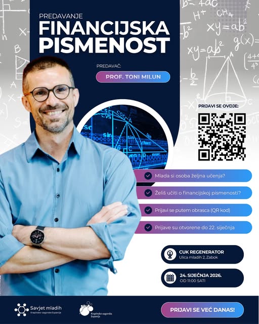 Savjet mladih Krapinsko-zagorske županije organizira predavanje o financijskoj pismenosti namijenjeno mladima, koje će u subotu, 24. siječnja 2026. godine, održati poznati profesor matematike i financijski edukator Toni Milun.