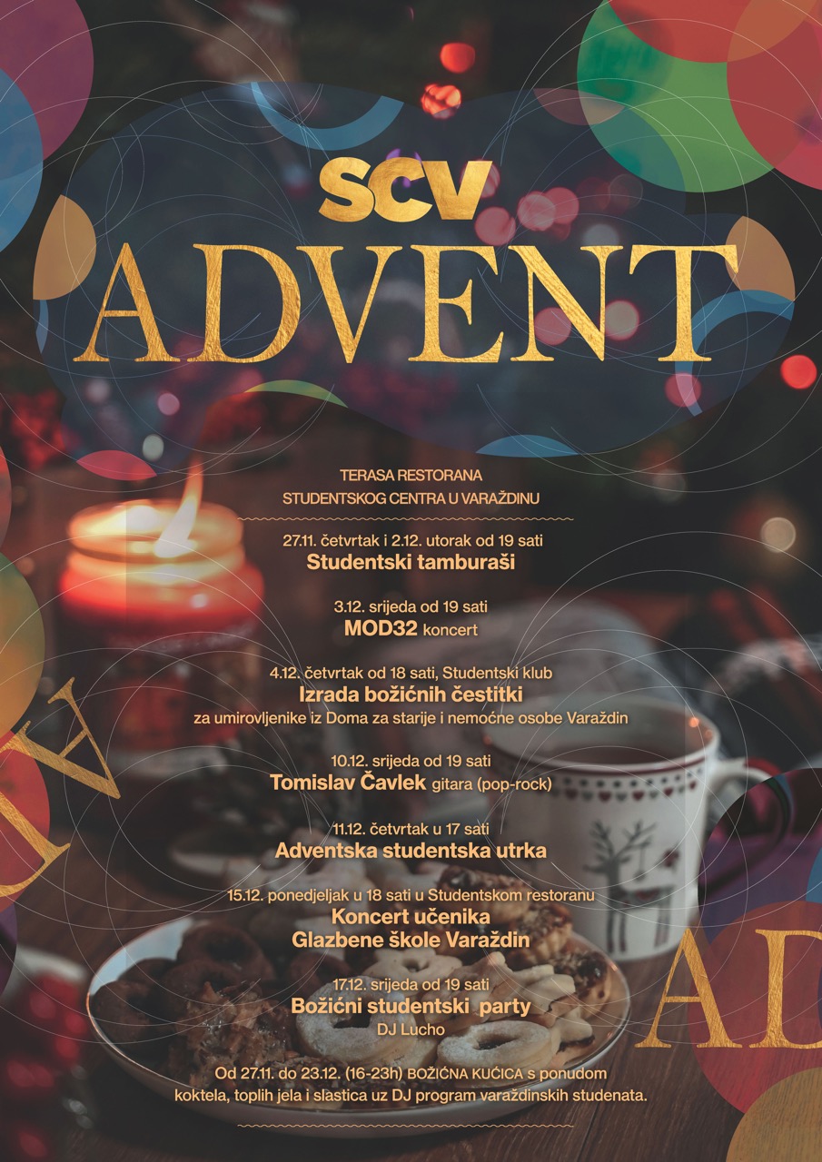 U četvrtak, 11. prosinca posjetitelje očekuje Adventska studentska utrka, a uz izradu božićnih čestitki za umirovljenike Doma za starije, studenti priređuju niz glazbenih događanja, DJ programe i koncert učenika varaždinske Glazbene škole i veliki Božićni party.