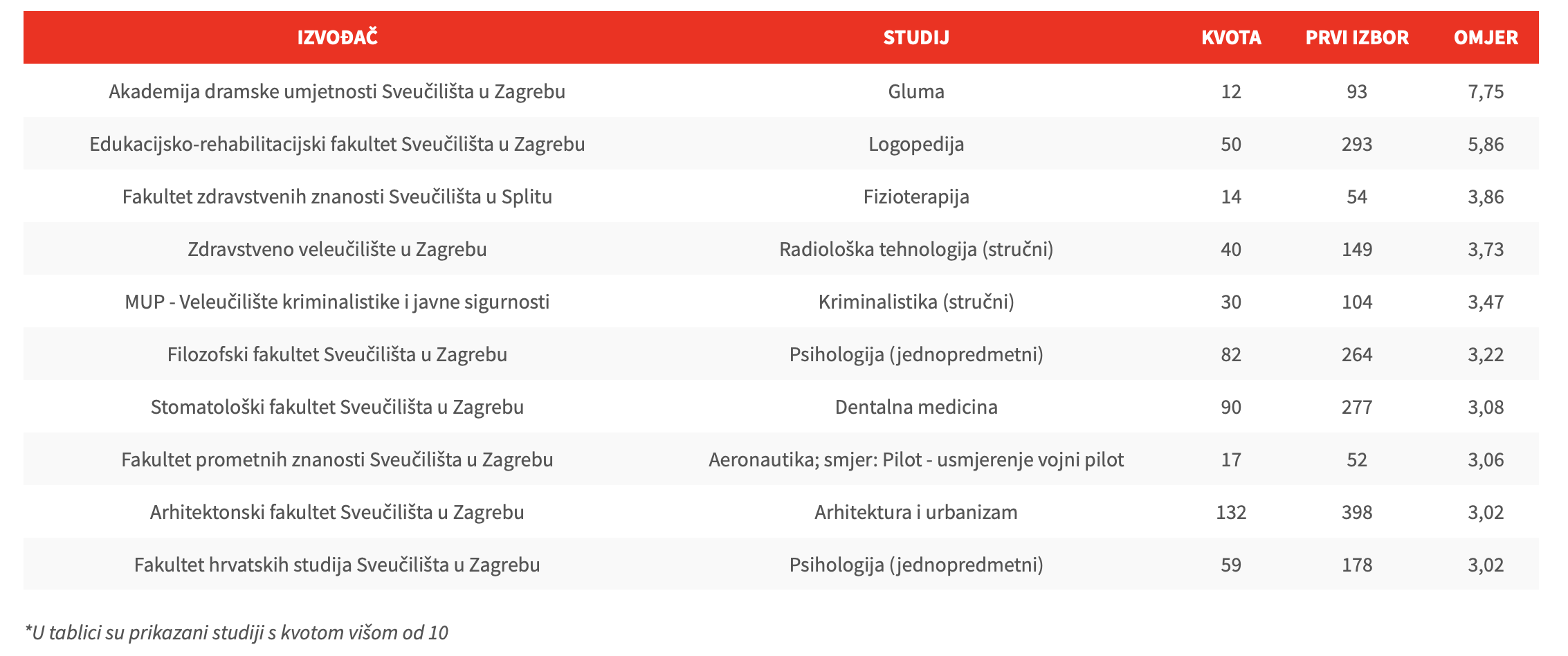 Prema najnovijim podacima Središnjeg prijavnog ureda Agencije za znanost i visoko obrazovanje, neki studiji ističu se izrazito velikim omjerom prijava i dostupnih mjesta. Najveća konkurencija trenutačno je na studiju glume na Akademiji dramske umjetnosti u Zagrebu, gdje se na svega 12 mjesta prijavilo čak 93 kandidata koji su taj studij odabrali kao prvi izbor. To znači da na jedno mjesto dolazi gotovo osam prijavljenih.