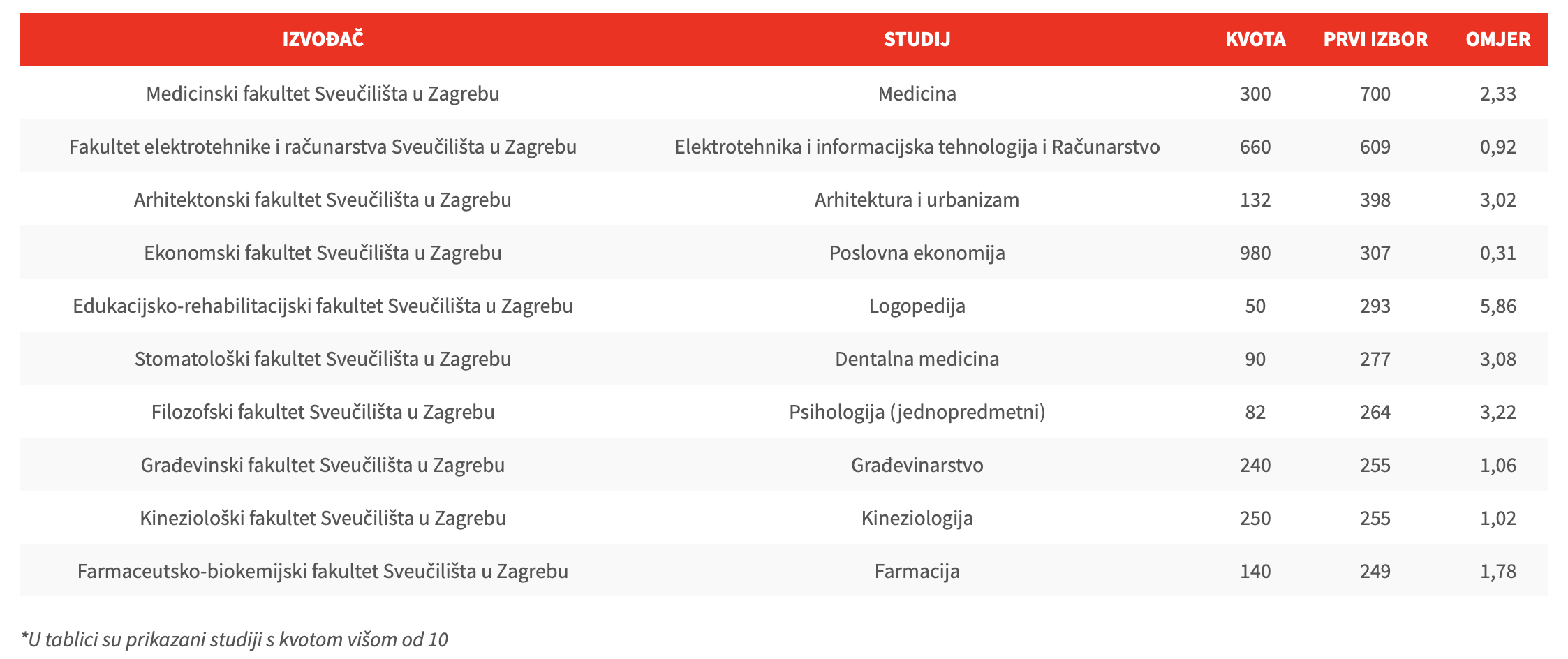 Kada se gleda ukupan broj prvih izbora, odnosno koliko je kandidata neki studij stavilo na prvo mjesto svoje liste, najviše interesa i dalje privlači medicina na Medicinskom fakultetu u Zagrebu. Za 300 upisnih mjesta prijavilo se čak 700 kandidata, što potvrđuje dugogodišnji trend velike popularnosti ovog studija.