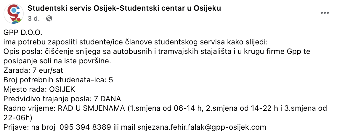 Studentski servis Osijek putem svojih službenih kanala objavio je oglas za studentski posao u Osijeku. Traži se pet studenata i studentica za čišćenje snijega na autobusnim i tramvajskim stajalištima te u krugu firme, uključujući i posipanje soli na očišćenim površinama.