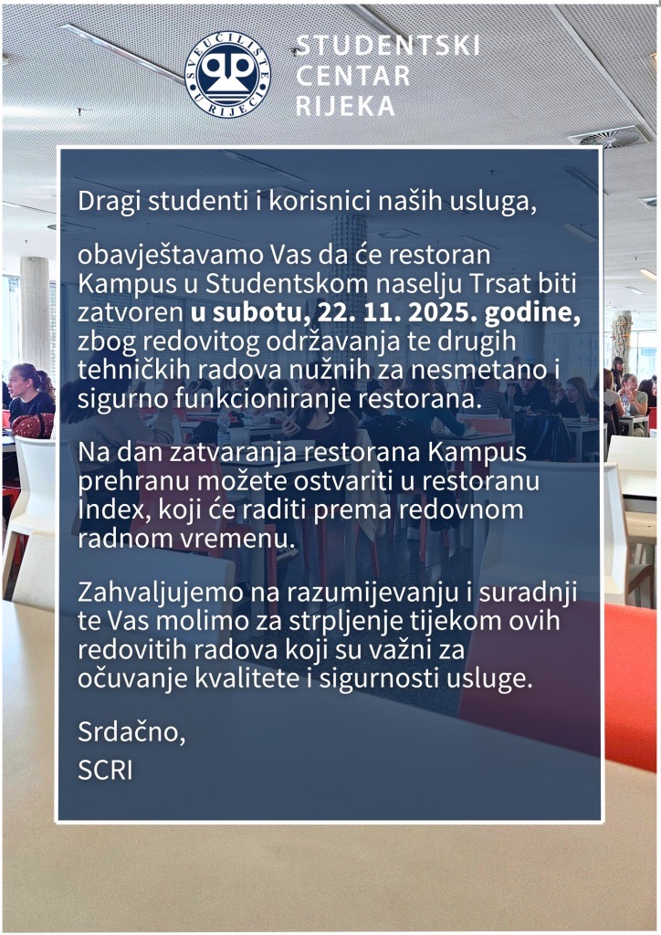Studentski centar Rijeka obavijestio je studente i korisnike svojih usluga da će restoran Kampus u Studentskom naselju Trsat biti privremeno zatvoren u subotu, 22. studenoga 2025. godine. Razlog zatvaranja su redoviti radovi održavanja i drugi tehnički zahvati potrebni za sigurno i nesmetano funkcioniranje restorana. Cijelu obavijest možete pronaći u službenoj objavi u nastavku.
