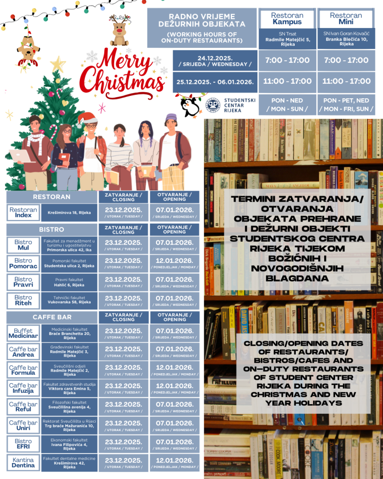 Studentski centar u Rijeci je objavio kako će studentski objekti uskoro zatvoriti svoja vrata zbog nadolazećih blagdana. Objavljeni su datumi zatvaranja i ponovnog otvaranja restorana, caffe barova, bistroa te radno vrijeme dežurnih objekata kako bi studenti mogli planirati prehranu i boravak u Rijeci tijekom zimskih praznika. Cijeli raspored provjerite u nastavku.