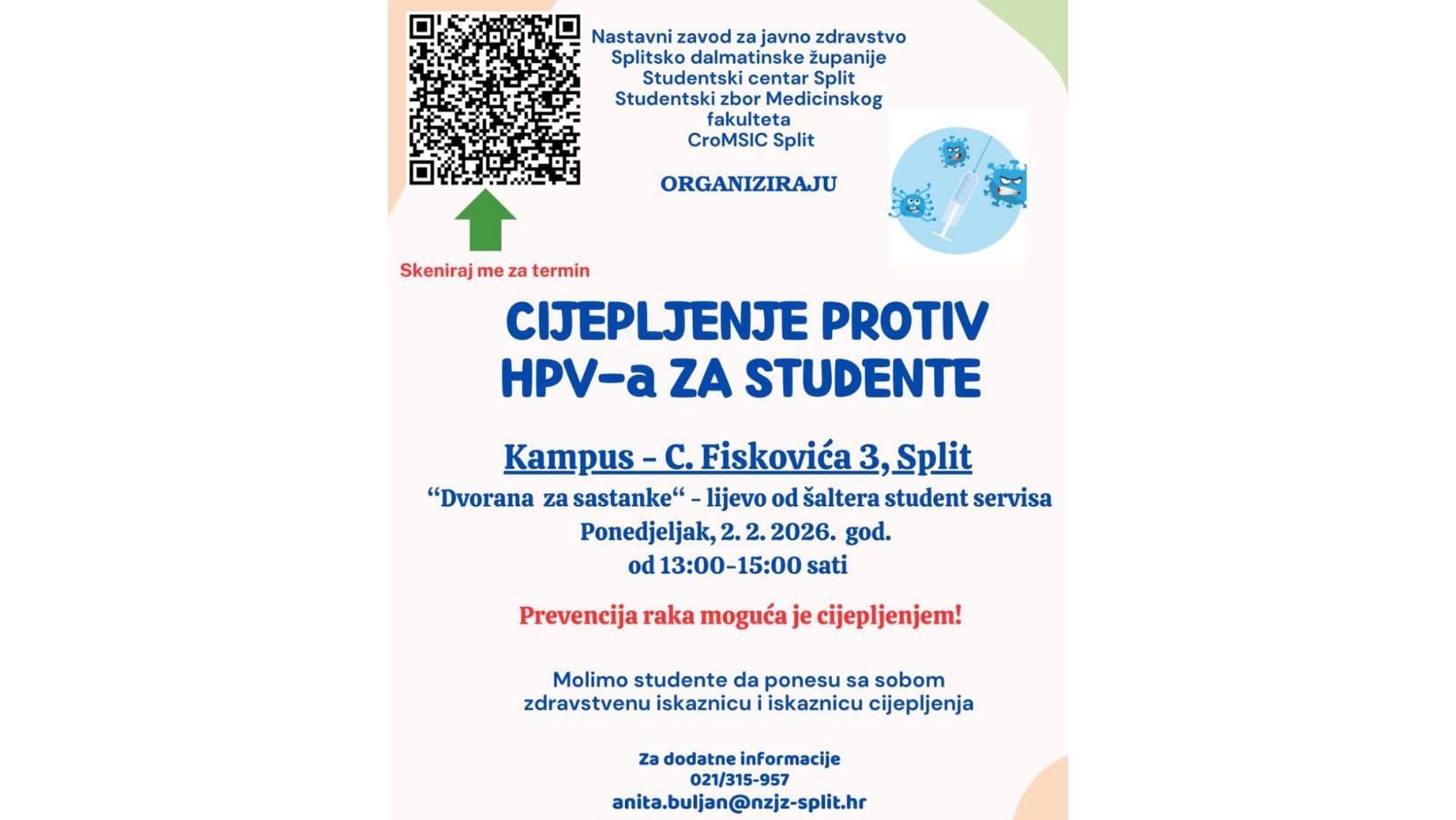Nastavni zavod za javno zdravstvo Splitsko-dalmatinske županije, u suradnji sa Studentskim centrom Split, Studentskim zborom Medicinskog fakulteta te udrugom CroMSIC Split, organizira akciju cijepljenja protiv humanog papiloma virusa (HPV), namijenjenu studentima Sveučilišta u Splitu.