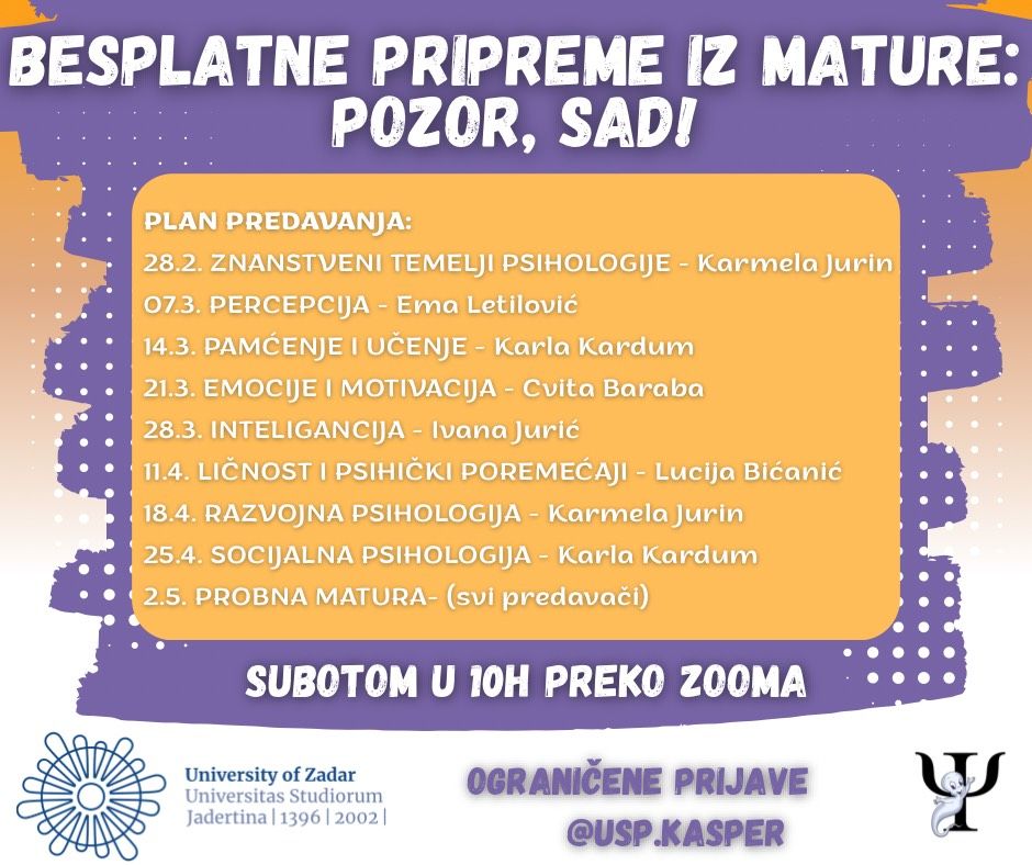 Pripreme za maturu iz psihologije organizira Udruga studenata psihologije Kasper. Planirano je osam predavanja sa zasebnim cjelinama koje se pojavljuju na maturi. Te cjeline su: znanstveni temelji psihologije, percepcija, pamćenje i učenje, emocije i motivacija, inteligencija, ličnost i psihički poremećaji, razvojna psihologija te socijalna psihologija. Datumi, predavači i teme predavanja objavljeni su na Instagram profilu Udruge. Maturanti se za pripreme iz psihologije mogu prijaviti putem obrasca.