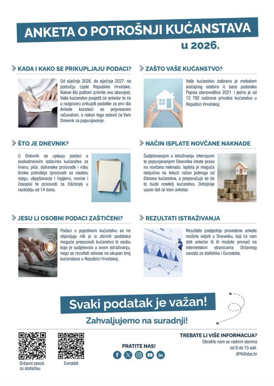 Tijekom cijele 2026. Državni zavod za statistiku provodi Anketu o potrošnji kućanstava, čiji je cilj prikupiti detaljne podatke o potrošačkim navikama, izdacima i uvjetima stanovanja u Hrvatskoj. Istraživanje odgovara na pitanja poput koliko kućanstvo u prosjeku troši na hranu, koliki su prosječni izdaci za stanovanje te koliko kućanstava posjeduje klimatizacijski uređaj.